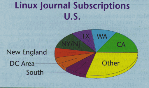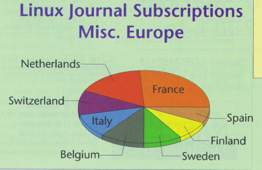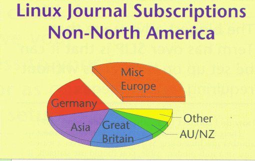 The non-North America pie shows Great Britian, Germany, and Asia each at approximately 17%. Australia and New Zealand have a surprising 7 percent. Miscellaneous Europe lets us know that there are plenty of people in the Netherlands to go to the International Linux Symposium which will be held in Amsterdam in December. (See related story in the Linux Events section, page 10.) Their 14 percent is second only to France's 22 percent.