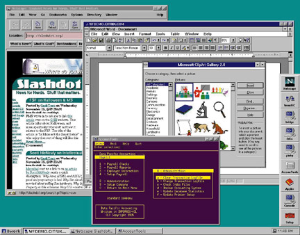 Neoware ships an ICA client with netOS that allows you to run Windows applications alongside X, Java and character applications. If you need to run Windows applications, you can set up an NT Terminal Server with Citrix's MetaFrame for Terminals (which is significantly less expensive than other MetaFrame products). The client can be started through the root window menus. In the screenshots (see Figures 2, 3 and 4), you can see all of these running alongside each other. Interestingly, when that screenshot was taken, only half of the system memory was being used--16MB were free.