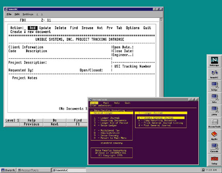 Many of our clients need to do only basic office tasks: access to the accounting system (which we can provide via a terminal session or a Java applet front end), e-mail and an office suite. An NC is a good match for these applications. Terminal emulation is provided by the TeemNC application. E-mail can be done with Navio's Netscape Navigator 3.0 for netOS. For an office suite, we install Applixware on a Linux server and execute it remotely from the NC (this is much faster than you might think).