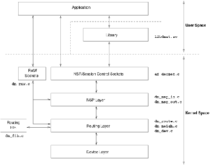 The main source file is af_decnet.c. This file contains the socket layer interface and parts of the DECnet NSP and session control layer code. Since the DECnet layering model does not map exactly onto the socket code, session control is provided partly by the kernel and partly by a user space library called libdnet.so.