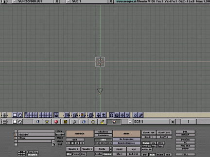 If you haven't used 3-D software before, the GUI may look complex and difficult at first, but you'll get used to it. When you first start up Blender, you'll see a large grid in the center of the screen--that's the 3-D window. Down on the bottom is the buttons area. Finally, at the top is the options area, where you choose which scene to edit, font paths, etc. If you are running on a small display (800x600 or less), you may not be able to see most of the top window. In this case, click on the edge of the top window and drag it down until you can see it. For now, you need only be concerned with the 3-D window and the buttons window.