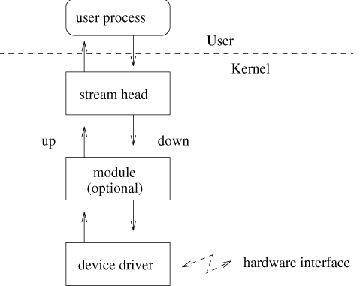 A STREAM (see Figure 1) is, in essence, a dynamically configurable stack of modules. Each module does some processing on a data flow as it goes from the device to the user or vice-versa. The user perceives a STREAM as a file. It is handled with the usual open, read, write, ioctl and close system calls. Data written by the user is packaged into messages, which are sent downstream. Data read by the user comes from messages sent upstream by an underlying device driver.