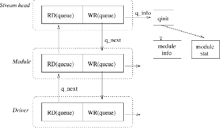 A quick overview of the LiS implementation would reveal a STREAM as a full-duplex chain of modules (see Figure 4). Each one consists of a queue pair: one for data being read and another one for data being written. Each module has several data structures providing those operations (i.e., functions) needed, as well as statistics and other data.