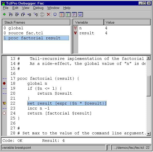 The fourth tool is a graphical debugger with a trick up its sleeve. Figure 1 shows how information is presented in the three panels. The upper-left panel presents the stack. Variables and their values are presented in the upper-right panel. Code being debugged is displayed in the lower panel. A toolbar provides the means of stepping in, through, around and over procedures and related code.