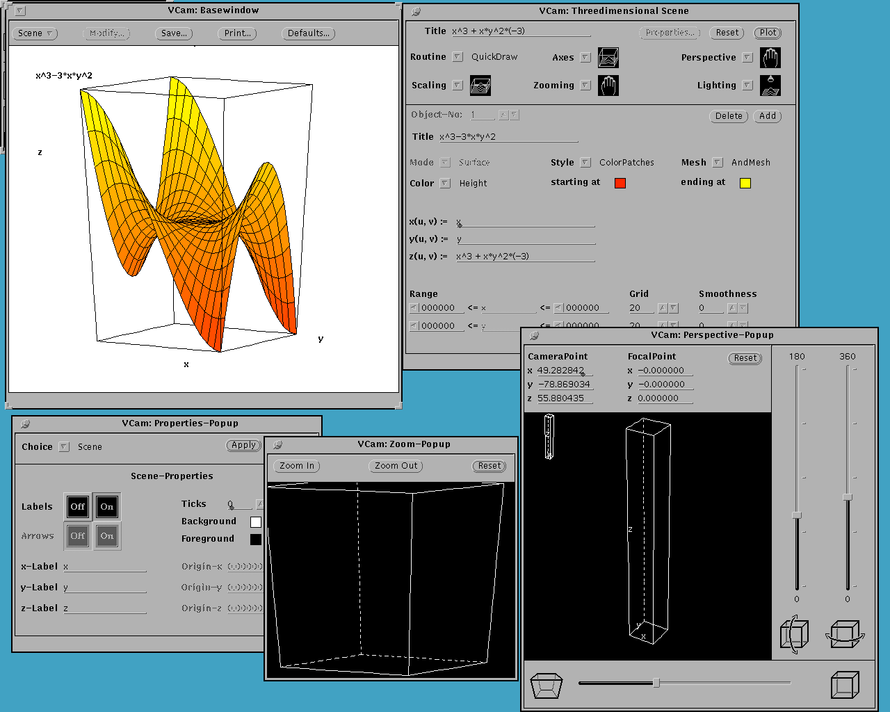>> plotfunc(1/(1+x^2),x=-4..4); >> plotfunc(x^3-3*x*y^2,x=-2..2,y=-2..2);Such commands will open up a VCam window with the function displayed in it, and also another window in which it is possible to change various plot options. The output of this second command is shown in Figure 2, along with various of VCams's windows.