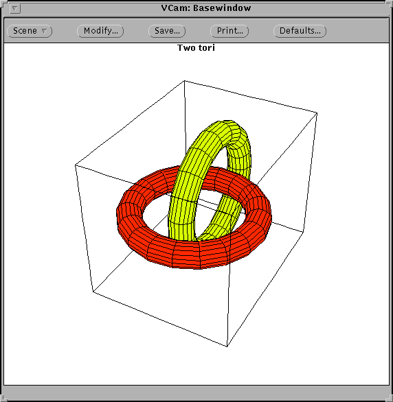>> plot3d(Title = "Two tori", Axes = Box, Labels = ["","",""], Ticks = 0, [Mode = Surface, [(5+cos(u))*cos(v), (5+cos(u))*sin(v), sin(u)], u = [0, 2*PI], v = [0, 2*PI], Style = [ColorPatches, AndMesh] ], [Mode = Surface, [sin(u), 5+(5+cos(u))*cos(v), (5+cos(u))*sin(v)], u = [0, 2*PI], v = [0, 2*PI], Style = [ColorPatches, AndMesh] ] );The result of this is shown in Figure 3.