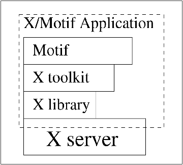 Access to the X Window System in a Motif application is accomplished primarily through three libraries: the X library (commonly referred to as Xlib) which provides the most primitive interface, the X Toolkit (Xt) upon which Motif is built and Motif (see Figure 1). A book covering Xt, or at least the Motif Programming Manual, would be a good investment if you become serious about GUI development. Many libraries choose to build on Xt rather than X, so it is reasonable to expect X and Xt to be consistent across UNIX flavors and available on any end-user configuration.
