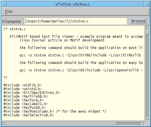 A good way to get a grip on a new technology is by looking at something built with it. Motif provides a rich and extensible environment, and it would take far too long to explain all the details behind the steps I will take; in fact, I will just scratch the surface of what can be done using Motif. The application I will use to illustrate Motif is a simple text-file viewer (see Figure 2). You should download the source (it's long) from ftp://ftp.ssc.com/pub/lj/listings/issue64/3392.tgz. I will refer to specific line numbers as I explain different aspects of the Motif API.