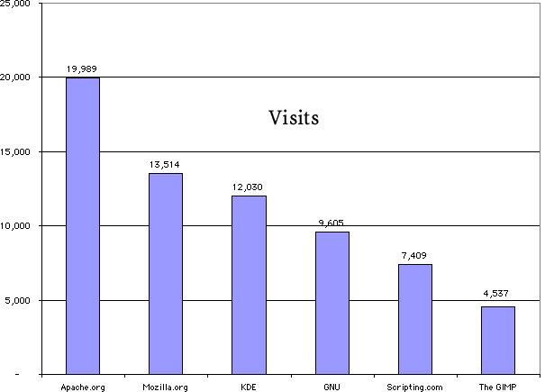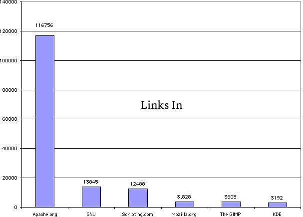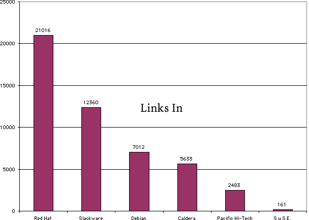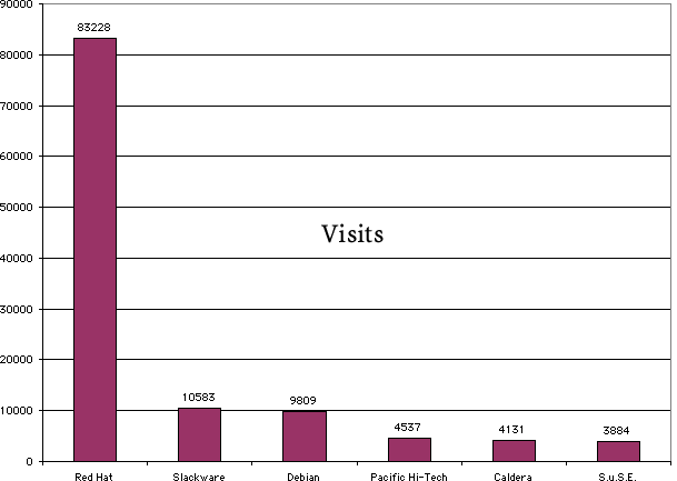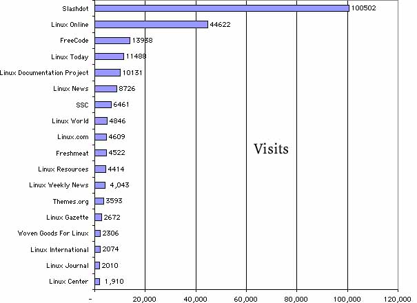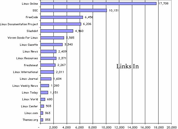 Notes: These numbers were collected on 5/13/99. ``Links in'' are from surveys of pages served across the entire Web. ``Vists'' are accumulated over the previous six months of activity by Alexa users, nearly all of which are on Windows clients. Some sites, such as Scripting.com and Slackware, contain high percentages of links and visits that are not Linux-related. One major site, Linux.com, went live from VA Linux Systems only in the last few days of the survey period. A follow-up survey on 6/1 showed a 24.6 percent increase in visits to that site.