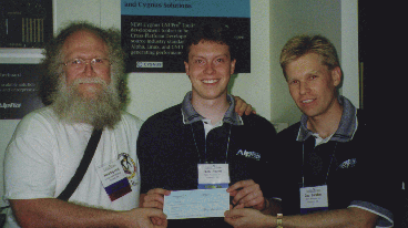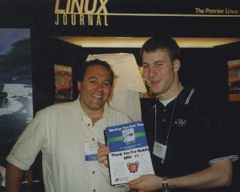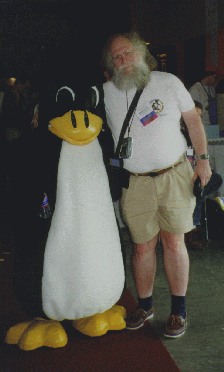 Alpha Processor, Inc., a Samsung company, announced they were joining Linux International; Richard Payne and Guy Ludden presented a check to Jon ``maddog'' Hall. I got the picture and then took several others of Jon, including one with a people-size Tux, who was roaming the show floor.