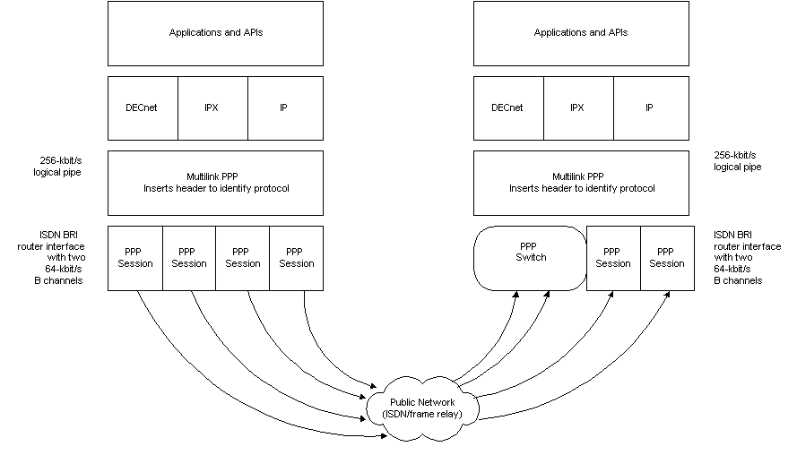 Here's an example of how MLPPP's segregated packet queueing works. Suppose a central site is connected to a remote site via two 64Kbps frame-relay links and two ISDN basic-rate interface (BRI) connections. Two types of traffic traverse these links: IP traffic from UNIX operations and DECnet traffic from a Digital Equipment Corporation VAX network. If the frame relay and ISDN channels are treated as one MLPPP bundle, both traffic types have access to the full bandwidth of the link at any given time.