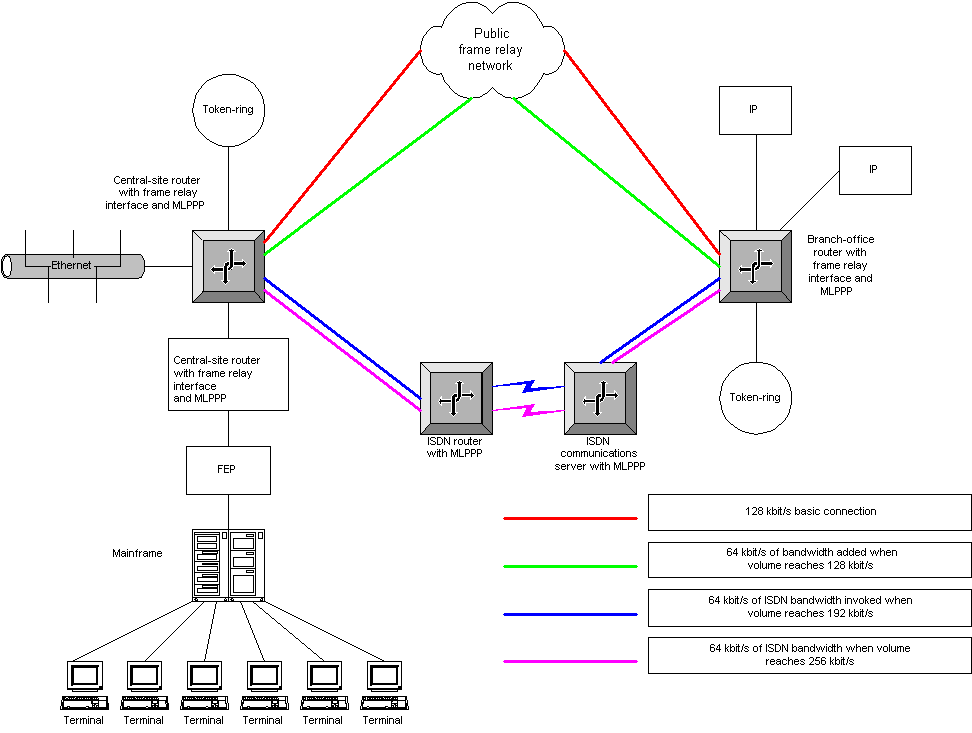 MLPPP's ability to combine separate PPP links into one logical data pipe is one of the most important features of the protocol. It allows additional WAN bandwidth or new WAN services to be added as needed without disrupting the existing WAN infrastructure. With MLPPP, different WAN services such as ISDN, frame relay and ATM can be used together. For instance, a network manager can establish a frame relay connection to serve as the primary link between a central site and a branch office, with ISDN serving as an adjunct when bandwidth demand rises (see Figure 2).