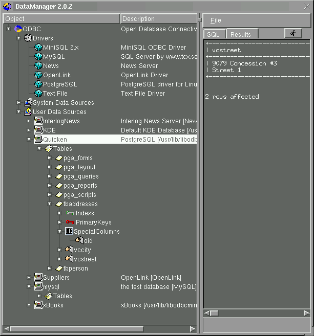 [MiniSQL 2.x] Description = MiniSQL ODBC Driver Driver = /usr/lib/libodbcmini.so.1.0.0 Setup = /usr/lib/libodbcminiS.so.1.0.0 FileUsage = 2Now run ODBCConfig to add, edit or remove data sources. You will need to be root to work with system data sources, but any user can add, edit and remove user data sources. Now run the DataManager, and you should see all ODBC data sources. When you try to expand the TreeView below a data source, you will be prompted for login information to connect to the data source. You can also try to connect to your data source using the isql command-line tool. Simply execute the command: