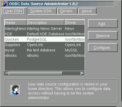 Application developers can now create portable data access code independent of the platform and the data source. Driver programmers can use the unixODBC driver template to get started on a new driver, then use Odbcinst when creating their install script/RPM. All Linux users can easily configure ODBC data sources for their applications with ODBCConfig, then take a look at what resources are available in a data source by browsing in the DataManager. Ease of use and functionality surpass other platforms which have had ODBC for a number of years. Most importantly, widespread adoption of unixODBC in popular Linux distributions will allow application developers to assume a desktop has these features and take advantage of them. Such features are of critical importance in having Linux fully accepted on an average user's desk.