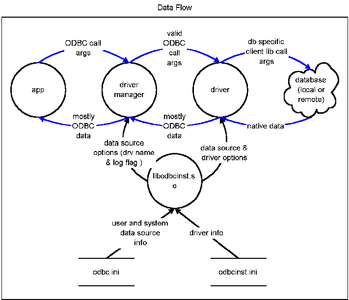The driver and the Driver Manager share 98 percent of their function names. This is not surprising when you consider that the Driver Manager passes off most processing to the driver. An important difference, however, is that the Environment, Connection and Statement handles contain different information. For example, the driver's Connection handle will often contain some database-specific data such as a socket handle, while the Driver Manager's Connection handle will usually contain very little aside from a pointer to the driver's Connection handle. unixODBC contains a driver template which should act as a good starting point for anyone interested in creating a new driver. It should be very easy to port a driver to/from Linux using unixODBC, because unixODBC is designed to support driver code from other platforms. A useful driver will implement, at a minimum, the following functions: SQLAllocConnect, SQLFreeConnect, SQLAllocStmt, SQLFreeStmt, SQLConnect, SQLDisconnect, SQLPrepare, SQLExecute, SQLFetch, SQLGetData, SQLNumResultCols and SQLColAttribute.