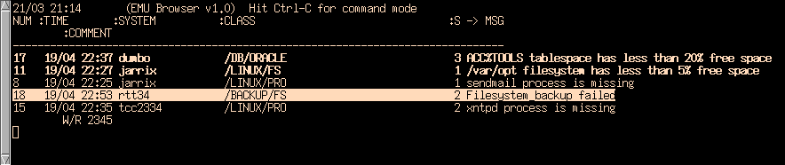 Time to live can be specified as seconds, minutes, hours or a fixed time in the form of HH:MM. A time-to-live of -1 stands for infinity, and the associated message will be displayed in reverse video (by eb) and the cleaner will not expire it. The only way to put the message away is with a delete command on the console. This allows a batch job or backup failures to wait until they are acknowledged. Time-to-live set to 0 is used with so-called pass-through messages. They are not stored in the EMU database (they are recorded in the log file), but are intended to trigger an action.