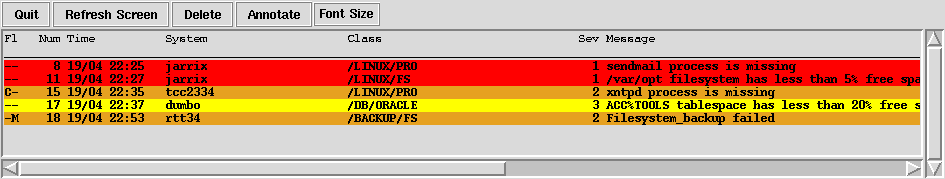 The eb console provides a basic display of messages. A new message is displayed in bold to draw our attention. A message can be deleted/acknowledged or annotated. Message annotations appear indented under each message. They serve the purpose of notifying others about details, such as a work request that has been logged. The message time shown on the console was the local time on the system that sent the first message. It helps identify when a problem occurred.