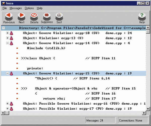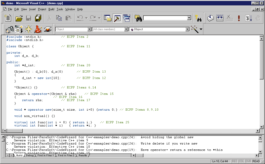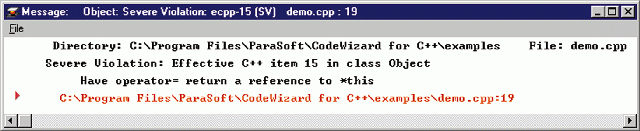 What kind of rules are we talking about? First of all, the items have each been given a rating according to the severity of the rule. The five ratings, from least serious to fatal, are: Informational, Possible Violation, Violation, Possible Severe Violation and Severe Violation (see Figure 1). An example of an Informational rule is item 2 under the Effective C++ list: ``Prefer iostream.h to stdio.h.'' So, for instance, if you include stdio.h in your code, one of the warnings that will come up will explain that you shouldn't use stdio.h when coding in C++ (see Figure 2). A Possible Violation is rule #17: ``Check for assignment to self in operator=.'' Item #22 catalogs a Violation: ``Pass and return objects by reference instead of by value.'' A Possible Severe Violation is something like, ``Don't try to return a reference when you must return an object.'' Severe violations can prove to be fatal to your program. Rule #10 is a good example: ``Write delete if you write new.'' Seems obvious, of course, but you may forget it and thus cause ugly memory leaks. The items are divided into different categories, such as ``Shifting from C to C++'', ``Memory Management'' and ``Inheritance and Object-Oriented Design''.