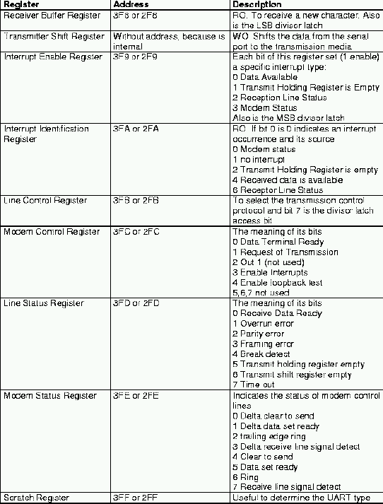 COM1 0x3F8 IRQ4 COM2 0x2F8 IRQ3Each I/O port has a range of addresses to hold various support registers. COM1 is mapped in memory from 0x3F8 to 0x3FF, and COM2 from 0x2F8 to 0x2FF. See Table 1 for a description of some of them. To set one bit in any register, first read the actual value, and then OR with the desired value, thus preserving the other bit values.