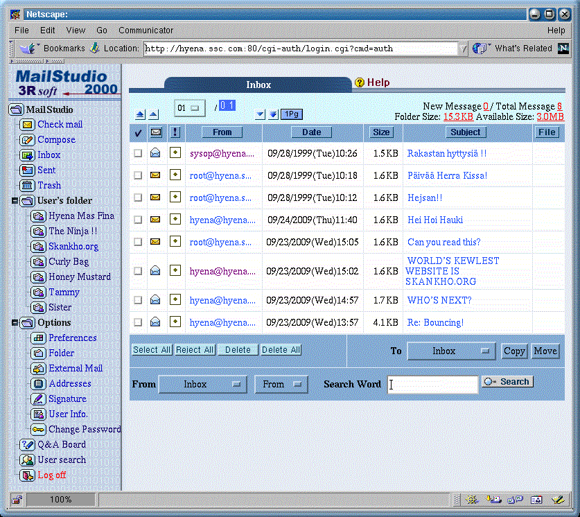 The uniform user interface offers a number of traditional e-mail features, such as mailboxes and address books, as well as some things which are quite modern (or even trendy), such as the ability to send e-mail as HTML with italics and graphics and all of that bother. (This tends to annoy people, actually.) By default, MailStudio keeps Inbox, Sent and Trash folders, and you can apparently add as many as you like, which will be kept in the user's folder menu. The Options folder contains entries for changing your preferences, folders, external mail configuration (for POP3 servers), address book, signature, user information and password. There is also a Question & Answer board for the system and a User Search function for finding others. The last option is ``Log off'' which kills the encrypted cookies used for user authentication.