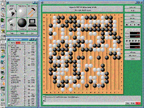 The Internet Go Server is the on-line meeting place for wired Go enthusiasts the world over. You can telnet in and play with a text interface, or use a graphical interface like CGoban. IGS is similar to the chess servers, with the typical commands applying like who, match, observe, kibitz, tell and shout. I find the atmosphere to be friendly enough, though less talkative than the chess counterparts. Also, blitz Go seems to be less popular than blitz chess, and as for lightning Go, I don't know. (Lightning chess is one or two minutes per game, a rather difficult schedule for Go.) If you want to check out IGS's well-designed web page (available in English, Chinese, Korean and Japanese), go to http://igs.joyjoy.net/. Or, if you want to go directly to the server, use telnet igs.joyjoy.net 6969 (yes, port 6969). There are a few other Go servers wandering about, No Name Go Server (NNGS) being one of the more popular. CGoban already knows the addresses and will connect you automatically.