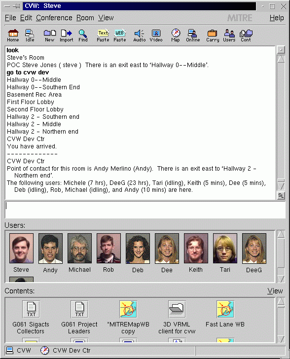 From it's inception in 1994, CVW was built on a client-server architecture. At the heart of the server is a MUD, Object-Oriented (MOO) from Xerox PARC (ftp://ftp.lambda.moo.mud.org/pub/MOO/). Once only within the domain of dungeons and dragons players, MUDs and MOOs have progressed to incorporate numerous social settings. Although providing a very descriptive environment, MOOs present one challenge to the average computer user today--they are predominantly text driven. With no fancy graphic interfaces or elaborate designs, a user simply connects to a server using a MOO client program or telnet, logs in and begins interacting within the environment.