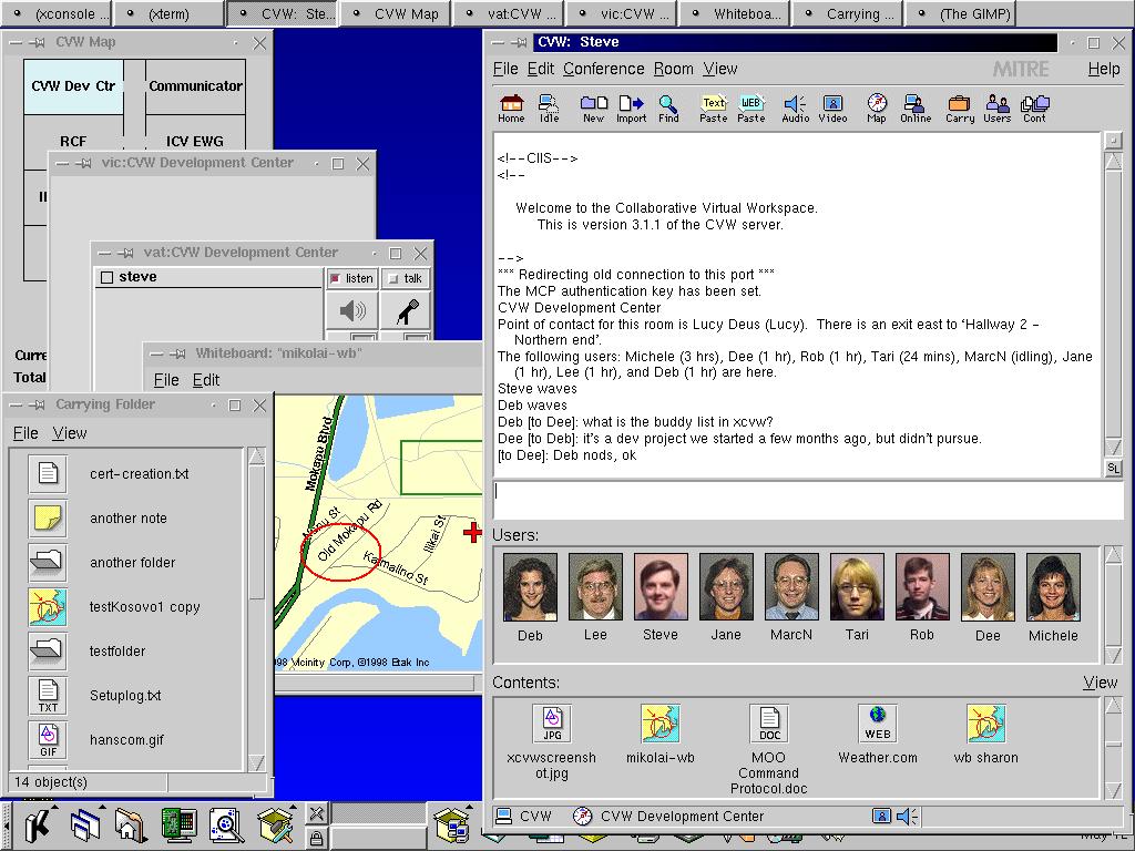 Since CVW has been made into an open-source project, MITRE will be concentrating more on developing a next-generation collaboration system. We hope many people will find CVW as useful to them as it has been to us and continue to improve on it. Since it is a relative newborn as an Internet project, many development possibilities exist. We hope CVW will continue to expose many people to the possibilities of computer collaboration.