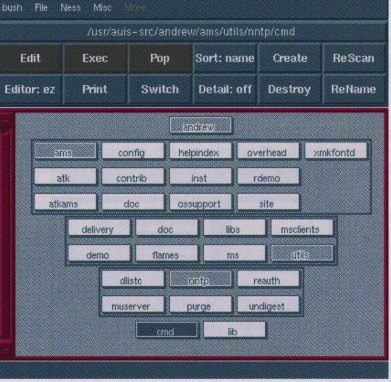 bush (see Figure 1) provides a graphical interface to the file system. It shows the directory hierarchy, filenames and their attributes. It also provides a window where the ez editor will run as well as a means to invoke an arbitrary command on a file. With bush you can sort the list, rename, and delete files, too.
