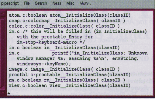 pipescript (see Figure 3) reads data from stdin and displays it in a window. This is very convenient with pipes, because the output data does not disturb your xterm window and yet is not in a file you need to remove. The data can be conveniently scrolled, searched or saved. I use it all the time for commands like tar tzvf auis63L1-wp.tgz | pipescript.