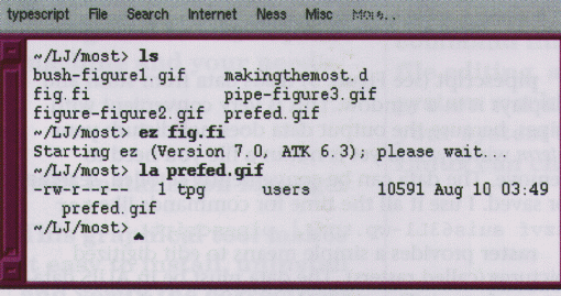 typescript (see Figure 4) provides an alternative to xterm. You enter commands to your shell in the input window and the results are shown in the same window where they can be scrolled, searched or saved. Typescript does not support curses like xterm does, so you cannot run vi or bash in a typescript, for example. However, you can use the tcsh or pdksh (ksh) shells.