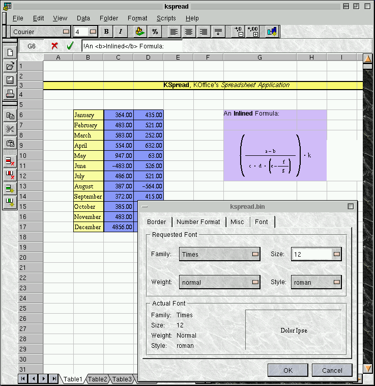 KParts is the new object framework used in KOffice for embedding application windows into each other. You can, for example, embed a spreadsheet window from KSpread into the word processor window from KWord, just as you could with the previous development versions. Since all KOffice components are now simple shared libraries and the whole document is handled in the same process, this happens much faster and smoother than before. Actually, the previous embedding framework was so slow (and buggy) it was hardly ever used. With KParts, there is no speed difference between working on the container part (the word processor in our example) and the embedded part (the spreadsheet in our example). In addition, embedded views can now be tilted, twisted, rotated and sheared, something which to our knowledge is not available on any other platform. I'll talk more about KOffice a bit later in this article.