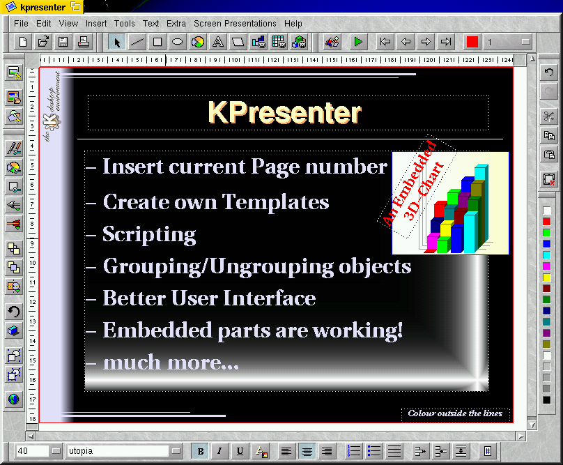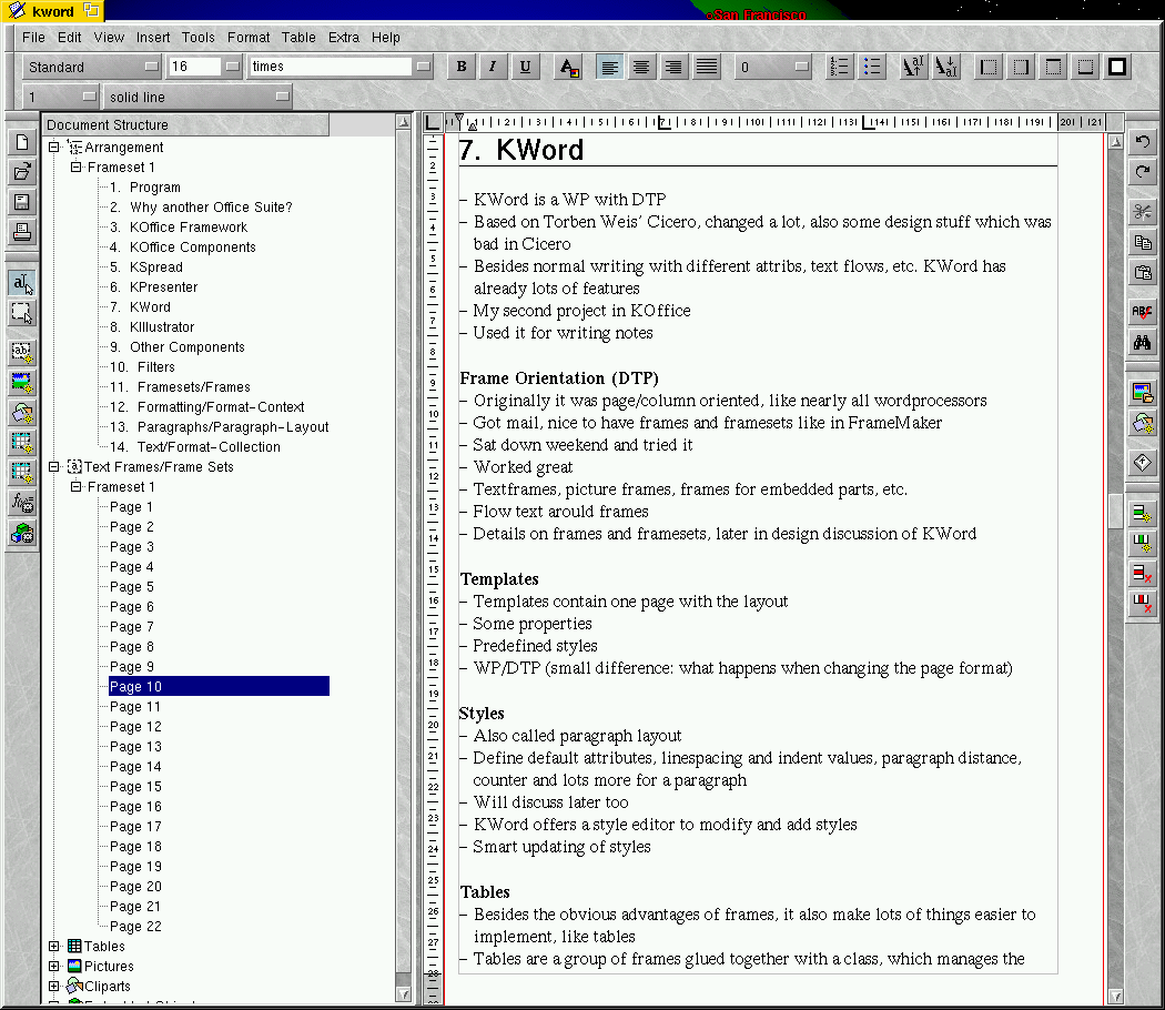 We have already talked about some internal changes in KOffice. The development of new features is also progressing. Implementing import filters is a very hard task, but Werner Trobin has already made some progress, so there is hope that KWord (see Figure 4) will be able to import Word 97 documents in the not too distant future. KPresenter (see Figure 5) now supports presentation templates, and KSpread (see Figure 3) has also received many more features too numerous to list here--check it out yourself. However, there are (besides the ``old'' applications KSpread, KWord, KPresenter, KIllustrator, KChart and KFormula) two new kids on the block. KImageShop is a multi-threaded image-manipulation program that aims at being as powerful as the GIMP, but easier to use. Also, KImageShop has a very clean C++ design that will make extensions much easier. KImageShop will not be ready for public use any time soon, but shows some very promising results. Finally, kdatabase is a database front end that aims at making database power more accessible for the end user, and of course, features embedding into other KOffice applications.