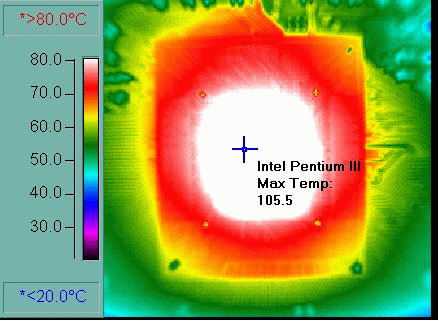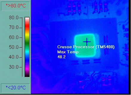 The figure demonstrates that an Intel and a Transmeta chip are as different as a stove and an ice cube--between 105.5 and 48.2 degrees Celsius. LongRun technology on the TMS400 even regulates clock frequency and voltage to correspond exactly to the demands of the application, drastically conserving energy and further reducing heat load.