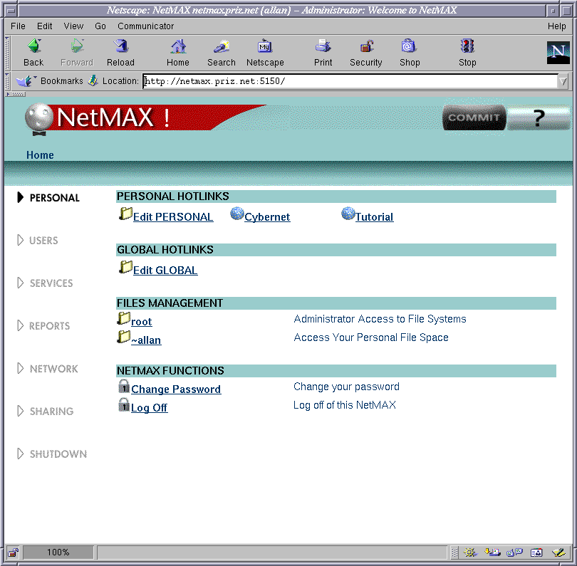 After you log in to the WebServer, you are taken to a framed Welcome page. From this page, you can take a tutorial of the interface, or you can begin to make changes. On the left side of the page is a menu with seven choices: Personal, Users, Services, Reports, Network, Sharing and Shutdown.