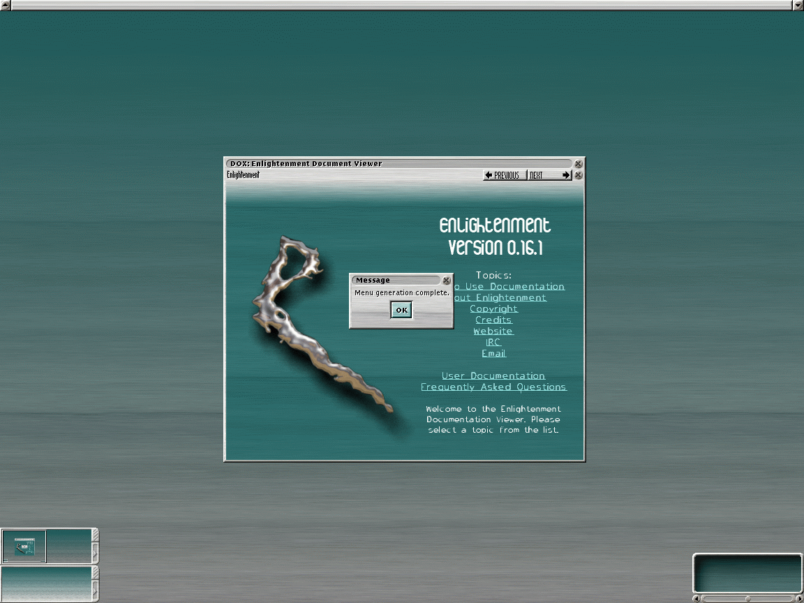 Clicking the left mouse button over the root window (i.e., the background) will bring up the Enlightenment menu, which is where you can get access to the rest of the root menus. Become familiar with the Help system option in this menu. You'll be referring back to it on a regular basis.