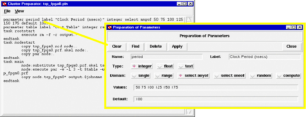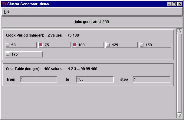 The plan file is processed by a tool called the generator, which asks the user to specify the actual values for the parameters. For example, a plan file might specify that a parameter is a range of integers, without giving the start, end or increment values. The generator tool allows the user to fill in these values. It then reports how many independent program executions are required to perform the experiment by taking the cross product of all parameter values. Figure 2 shows a sample generator interaction with a CAD tool, where the clock period parameter is set to values of 75 and 100 nanoseconds and the cost table parameter is varied from 1 to 100. This interaction generated 200 individual executions of the CAD package.
