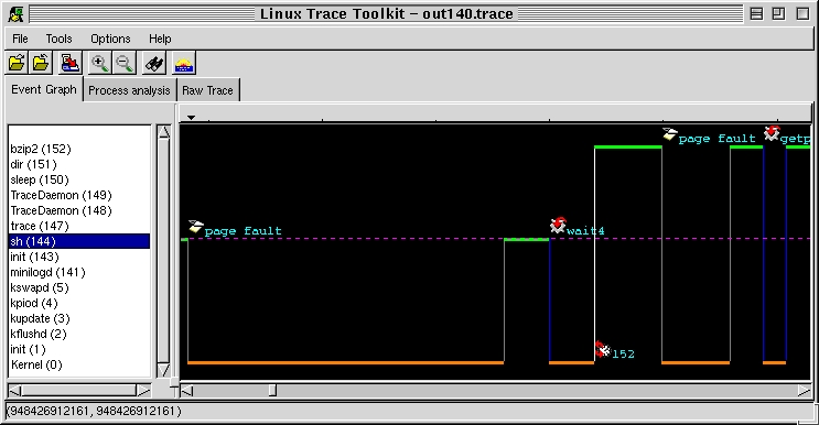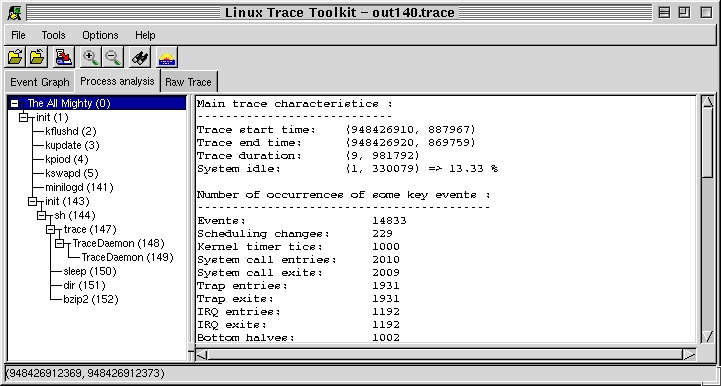 traceview out140The traceview script accepts one argument: the base name of the generated trace. It then executes the trace toolkit front end, passing it the out140.trace and out140.proc files. Note that the front end can be invoked manually and can be used as a command-line tool as well. In the latter case, it can be used to dump the contents of trace in a human-readable format or perform a detailed trace analysis. The complete options are described in the documentation included with LTT.