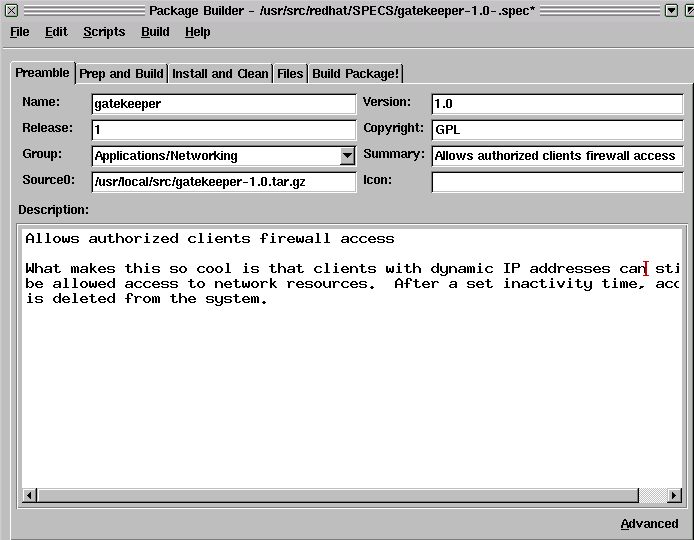 Summary: Allows authorized clients firewall access Name: gatekeeper Version: 1.0 Release: 1 Copyright: GPL Group: Applications/Networking Source: ftp://ftp.mycompany.com/pub/packages/gatekeeper-1.0.tar.gz URL: http://www.mycompany.com/ Packager: Chef Marcel ExclusiveArch: i386We begin with a simple summary description of the package. This is followed by the name, a version number, and a release number. If you have ever downloaded or installed with RPM, you are familiar with what is happening here. My package, when complete, will be named gatekeeper-1.0-1.i386.rpm. I include a copyright statement, the source location (where the package can be downloaded using FTP), a URL for documentation on the package, and the chef who put the whole package together is mentioned as ``Packager''.