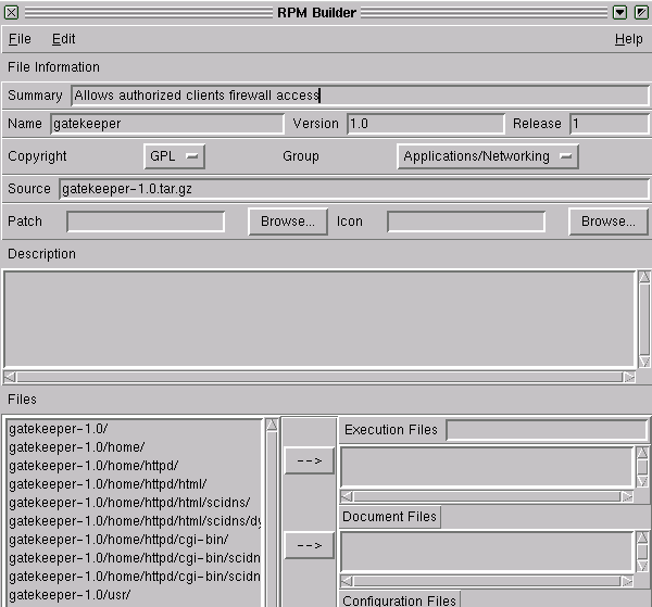 %files %doc README /home/httpd/html/gatekeeper/keypad.html /home/httpd/cgi-bin/gatekeeper/locksmith.pl /usr/local/.Admin/sethosts.pl /usr/local/bin/suguardWhile you are analyzing the wonderful simplicity of this section, note also the %doc parameter. The file I include here will automatically get installed under the /usr/doc hierarchy on my system to represent the package. In this case, the directory would be /usr/doc/gatekeeper-1.0 with one file (README) sitting underneath it.