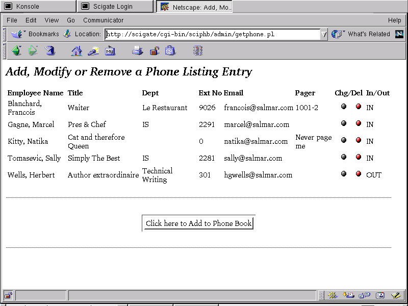 The phone book? But, of course. In fact, in honor of this month's issue celebrating ``The People Behind Linux'', we are cooking up a web-based telephone book made with rich, yet low-calorie, open-source software and our secret ingredient, Linux. I think you will find the recipe quite enjoyable and practical too, non? What is the point of knowing all these people if you never talk to them? That is why François' mother insisted that her name be put in. I jest. Please sit, mes amis, while I show you how to create your own web-based telephone book, which is sure to become a centerpiece of your intranet. For added spice, this wonder of the intranet even provides an IN/OUT board.