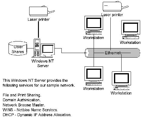 First, let's take a look at a sample Windows NT network and see what services are being provided (Figure 1). A Windows NT server has been configured as a file and print server. Users log in to the Windows NT server, using their Client for Microsoft Networks service with their network credentials. Once the user has been validated, a logon batch file is executed that assigns a user's home directory, various network drives and printers. The NT server also keeps track of which computers are on the network and the services they provide; clients can use this information in the Network Neighborhood.