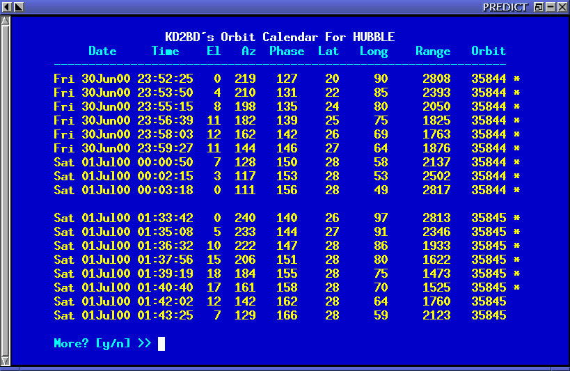 PREDICT includes two orbital-prediction modes to predict any pass above a ground station, or list only those passes that might be visible to a ground station through optical means. In either case, predictions will not be attempted for satellites that can never rise above the ground station's horizon, for satellites in geostationary orbits, or satellites that appear to have decayed in the earth's atmosphere since the last Keplerian orbital data update. If a satellite is in range at the starting date and time specified, PREDICT will adjust the starting date back in time until the point of AOS, so that the prediction screen displays the pass in its entirety from beginning to end. Figure 2 shows the orbital prediction mode of several passes of the Hubble Space Telescope in range of New Jersey in early July, 1999.