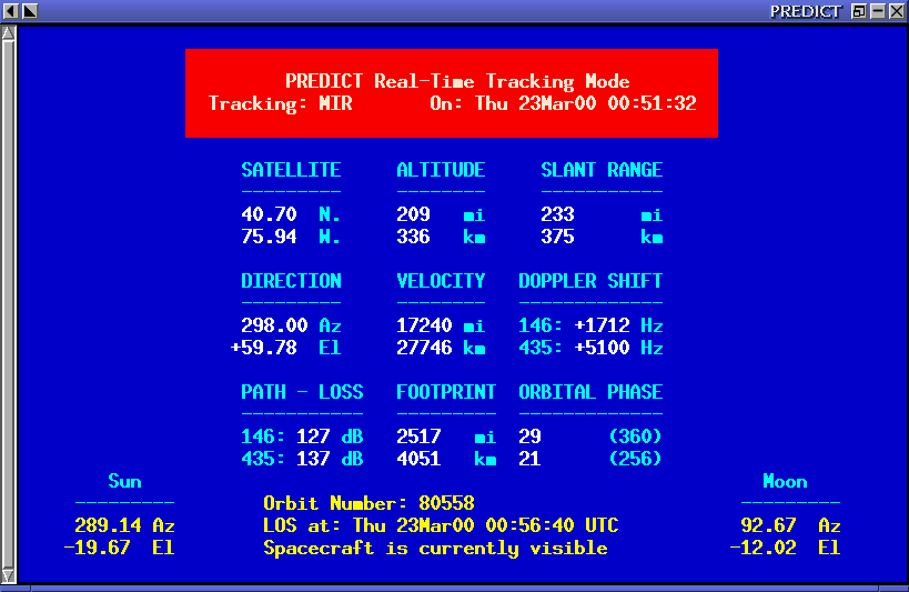 Once the program is built and installed, the user is asked to enter his latitude, longitude and altitude above sea level. A database of Keplerian orbital data is also required for the satellites of interest to the user. A database of amateur radio and several ``high-interest'' satellites is included with the program to get things started. Since the accuracy of Keplerian orbital data seldom remains high for long periods of time, facilities are included in the program to permit the database to be updated from more recent element sets. A simple shell script is included with the program to facilitate this update through an anonymous FTP connection to ftp.celestrak.com. This script may even be invoked through a crontab, permitting automatic updates of PREDICT's orbital database to take place on a regular basis without the need for user intervention.