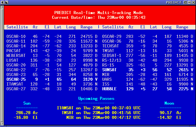 In addition to predicting satellite passes, PREDICT allows satellites to be tracked either individually or as a group of 24 using the program's Multi-Satellite Tracking Mode. The positions of the sun and moon are also displayed when tracking satellites in real time, as are the eclipse and optical visibility conditions of the satellites in the database. Real-time tracking data is available to socket-based clients when PREDICT is running in either the single-satellite or the multi-satellite-tracking mode. Figure 3 displays tracking coordinates for a single satellite in real time. Real-time positions for 24 satellites are shown in Figure 4, along with a schedule for upcoming satellite passes. Satellites currently in range are highlighted for easy identification.