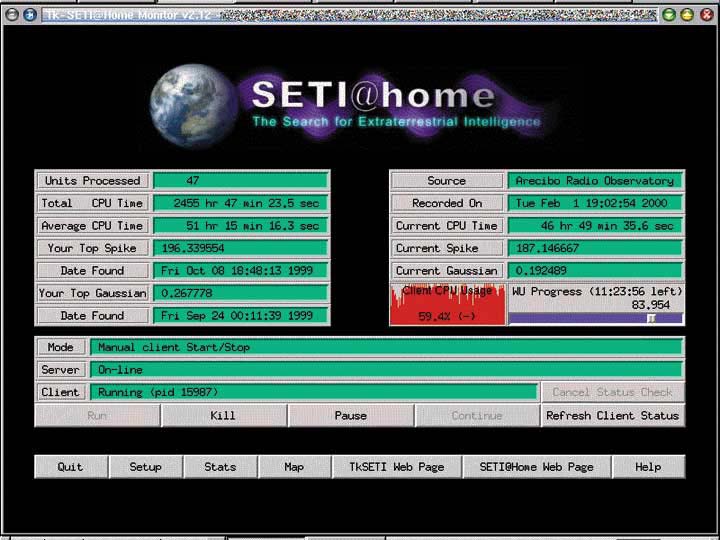 0 * * * * cd /root/setiathome; ./setiathome\ -graphics<\n> -nice 19 > /dev/null 2> /dev/nullCurrently, SETI@home runs with a text-only client, but the latest version also comes with an experimental ``screensaver mode'' program called xsetiathome. The -graphics option in the crontab above is required if you wish to use this experimental ``xsetiathome'' GUI front end. Even before this GUI feature was added, Linux SETI users were creating their own GUI clients to give setiathome a friendlier face. One of my favorites is still TkSETI from Rick Macdonald. You can download TkSETI from http://www.cuug.ab.ca/~macdonal/tkseti/tkseti.html. One of the things I like about it is the ability to check my progress against my other friends who run SETI@home. At this moment, Chef Marcel's lovely wife, Sally, is way ahead, but François is way behind.