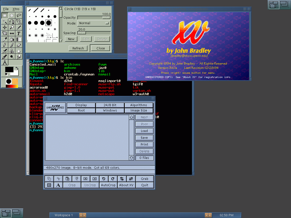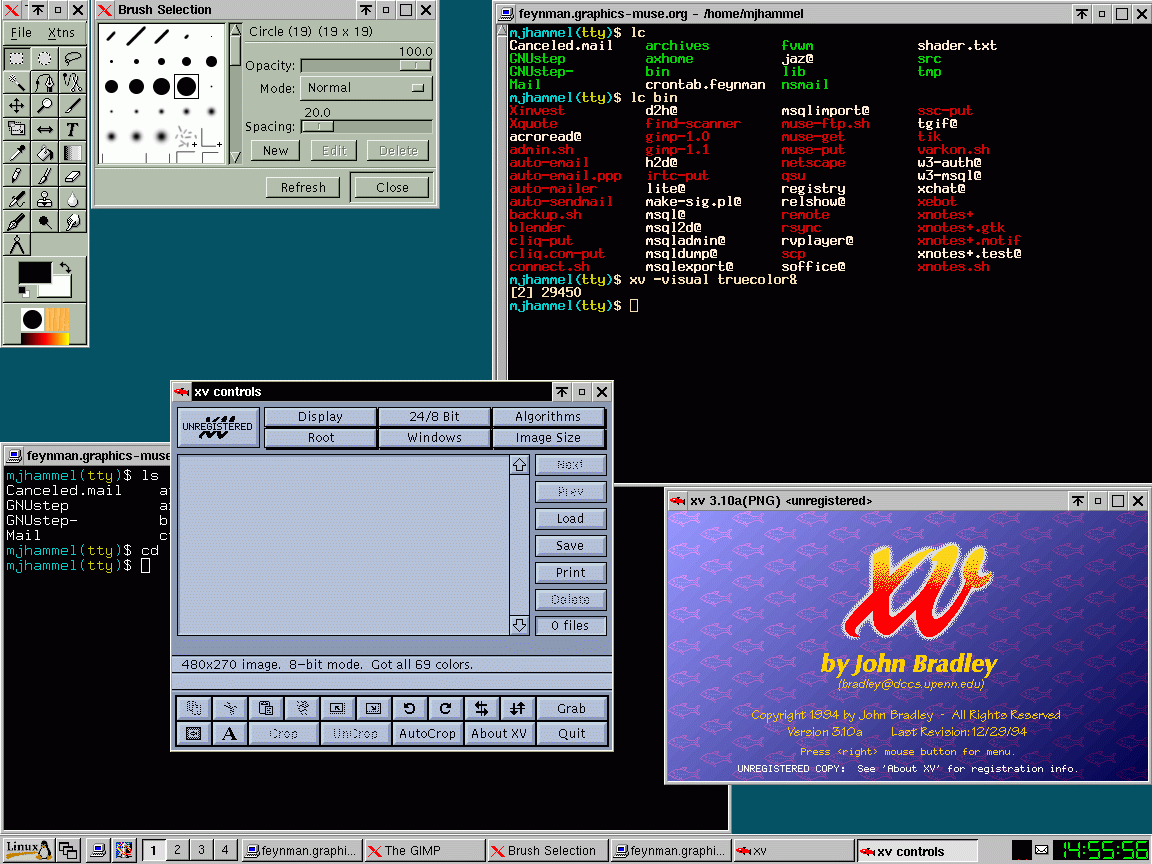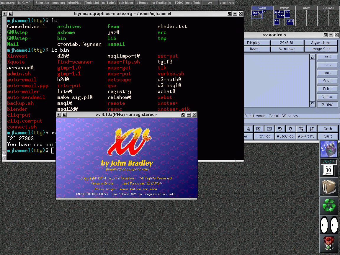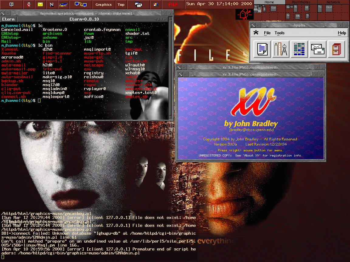 Above all else, the window manager, to an old UNIX hack like myself, should help me do my work. It shouldn't sing and dance in front of me and then do the work. After everything I've said about personalizing the workspace, my way of doing so is to remove the visibility of the workspace, save for a clever X Files-style background I generated with the GIMP. I use a toolbar across the top of the display with a ton of menus for launching various applications. It is a bit of an annoyance that FVWM requires me to restart the window manager every time I make a change to one of the menus, but it's only a minor annoyance.