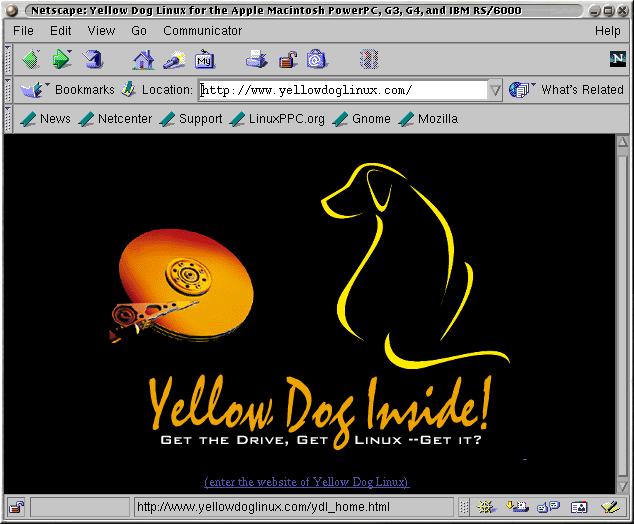 Now for the defining moment. I type startx -- -bpp 16 and I get the blue desktop and the X cursor, then back to the command prompt. I try again with bpp 15, and I go straight into X with a default KDE desktop. There are some snappy YDL links on the desktop leading to the YDL web site for documentation and updates. Another minor annoyance is the ``Home'' link generates an error that says ``config file has no `Type=...' line''. The ``Support'' link does launch Netscape and triggers my demand-dialing connection on the server and takes me to Yellow Dog's support page--yay, networking works! (See Figure 3.)