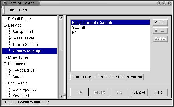 My reading on the mailing lists indicates that esd is the best working sound server for PPC, so I launch ``switchdesk'', change my desktop environment to GNOME and restart X. GNOME now comes configured to use sawmill, rather than Enlightenment, but there is an option in the GNOME Toolbox to change to Enlightenment. (Watch it here, because it says Enlightenment is the current window manager. I actually had to select sawmill, save the changes, then select Enlightenment to make it take. See Figure 5.) I do this, enable system sounds and set up my preferred desktop theme, colors, etc., then shut down and restart X. I've got system sounds and am greeted by a female voice welcoming me to Enlightenment (see Figure 6). I pop in my favorite David Torn CD and run the GNOME CD player applet, and I'm one happy camper. One annoyance is that restarting X seems to place the blue desktop background over my chosen pattern until I reset it. I found I had to go into GNOME's settings rather than Enlightenment's to turn the blue background off.