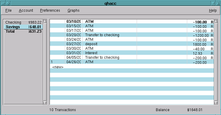 At version 0.4.3, QHacc is the youngest of the programs at which I looked. I did find one problem. If I entered 00 for the year, it used 1900. Also, QHacc does not offer the ability to import QIF files.