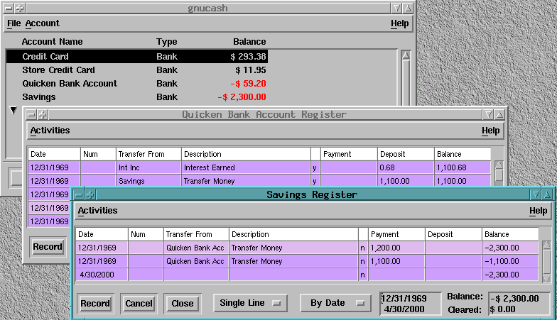 GnuCash is the most ambitious financial program being developed at this time. It offers the greatest variety of account types, sub-accounts and stock price retrieval. This program was the most difficult to compile and get working because it depends on quite a few other programs, libraries and Perl modules. I looked at both the stable version (1.2.5) and the current development version (1.3.6).